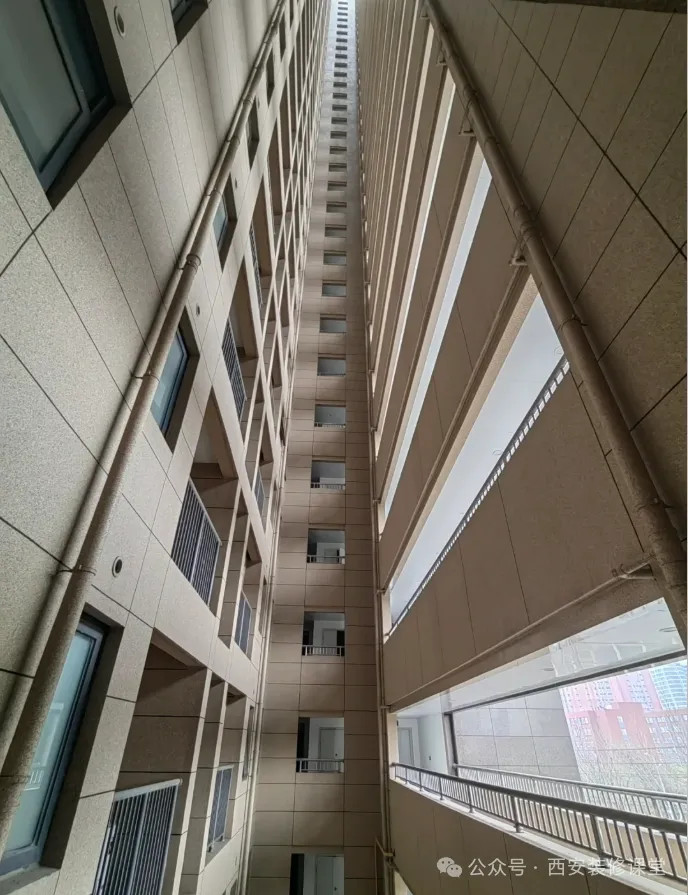 网友@卡卡洛:连廊半封闭的设计,存在安全隐患。尤其是在雨雪天气条件下,连廊地面会出现湿滑,行走时容易滑倒,而且缝隙较大,还有风险可能有高空物体坠落。