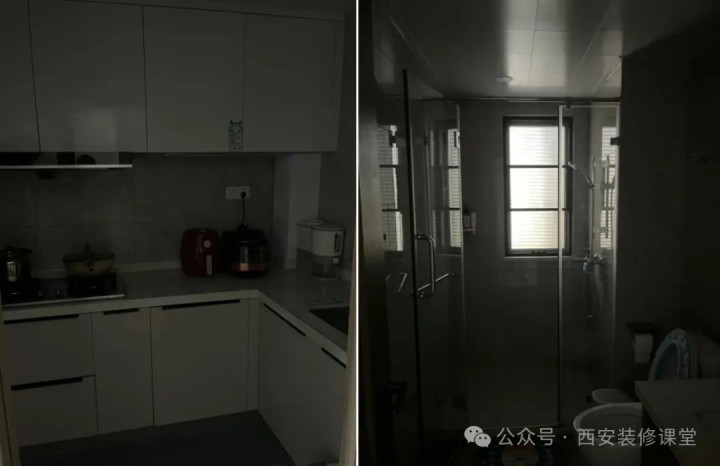 网友@蛋汤:短连廊的后果就是采光不好,北边厨房,客卫,书房都不好,进去拿个东西可以,但是想办个事必须开灯。因为连廊太短,客卫,厨房窗户都对着电梯间的墙,这也是造成采光更加不佳的原因。